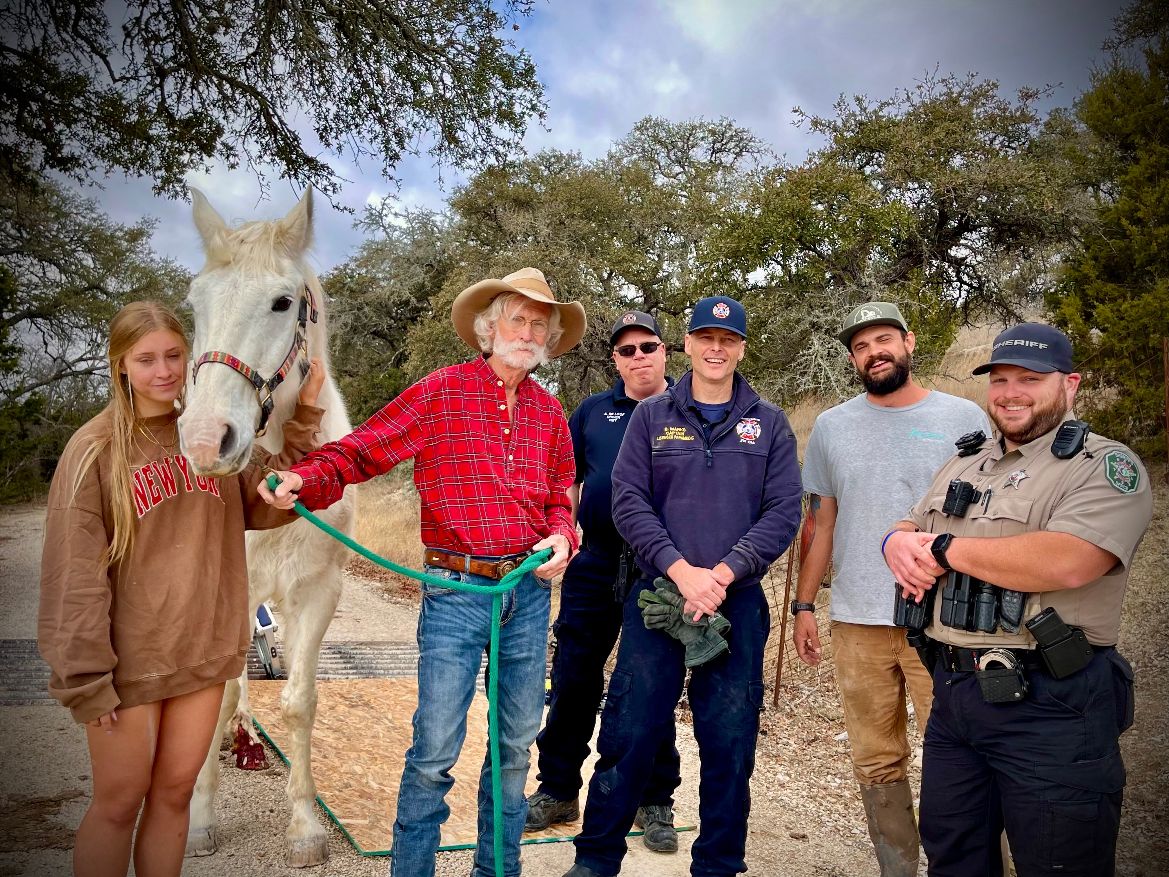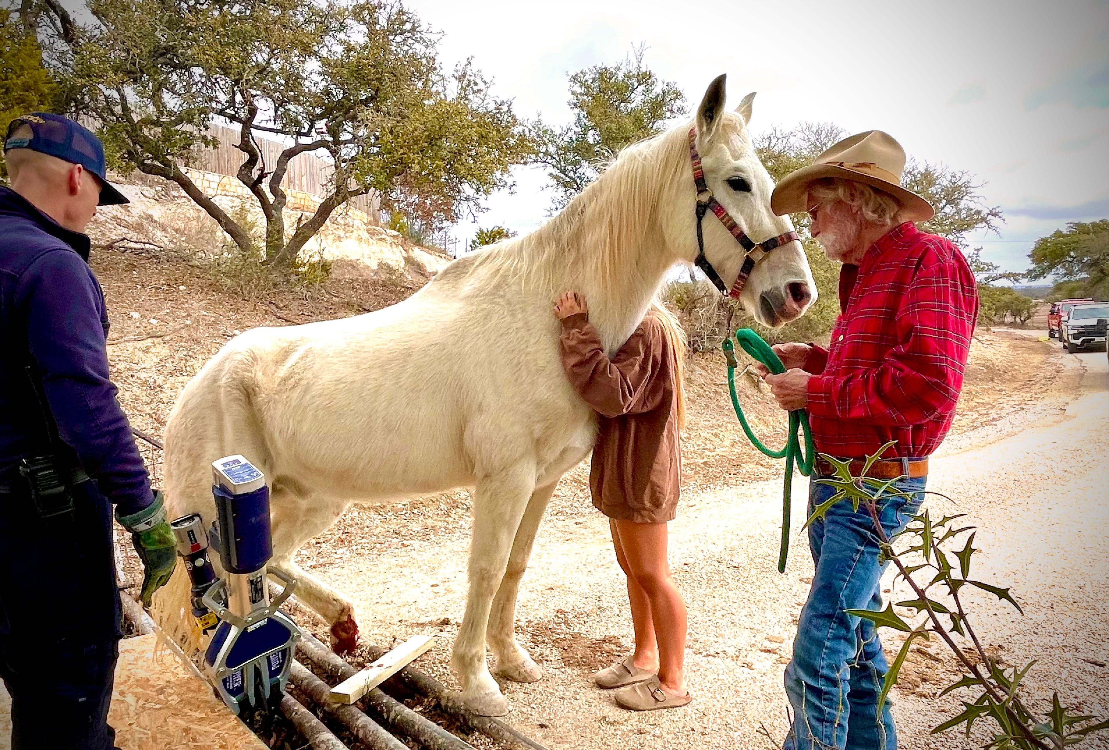 Suddenly, there was a crowd of capable men calmly sizing up the situation, trying out different solutions. The teenager, Kaitlyn, visibly shaken, but following Chuck’s direction, fetched water for her horse. She hugged the beautiful white creature, whispering words of comfort and encouragement with tears running down her cheeks, while the men worked quietly and gently to free him.