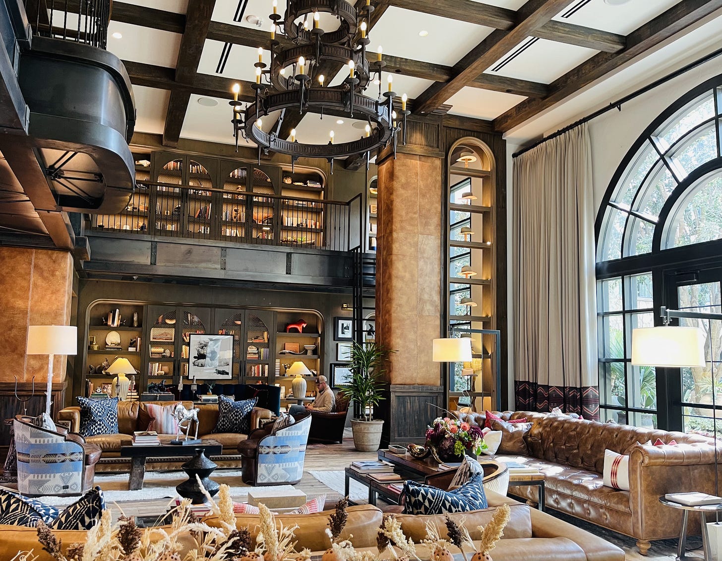 Decked out in the finest Yellowstone decor, tufted leather couches mix it up with Pendleton saddle blanket covered armchairs, and bordello blue, velvet fringed settees. Soaring high above was a tiered antler chandelier, setting off the two story library filled with books on Texas history.